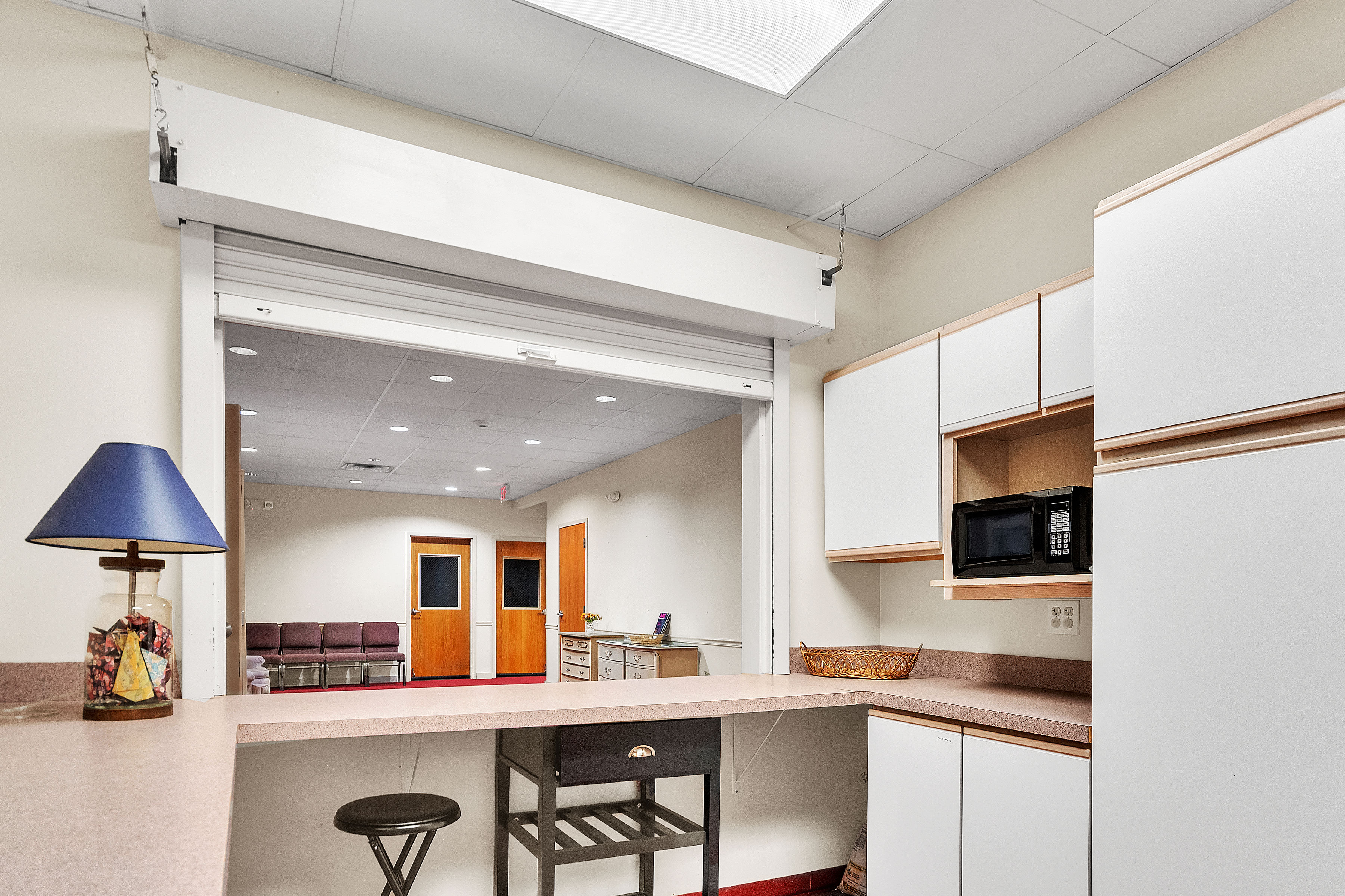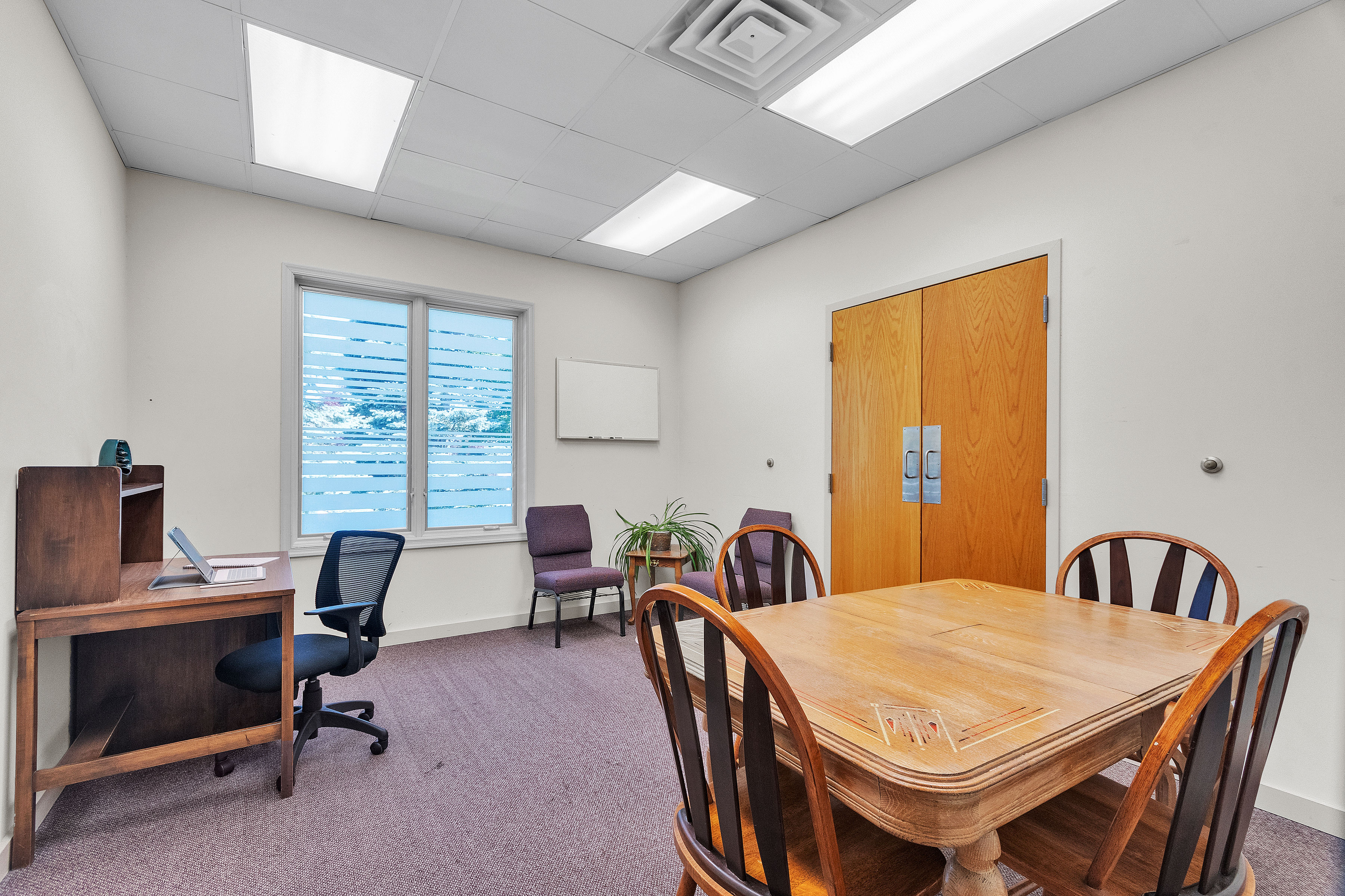 A quiet space with a table and desk, great for small meetings or event storage